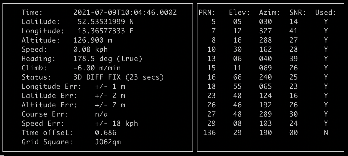 For the first time, you will see loads of ,,,, between the lines, but they’ll get less and less depending on how quickly the fix comes in. With the antenna outside, it shouldn’t take more than a couple of minutes.