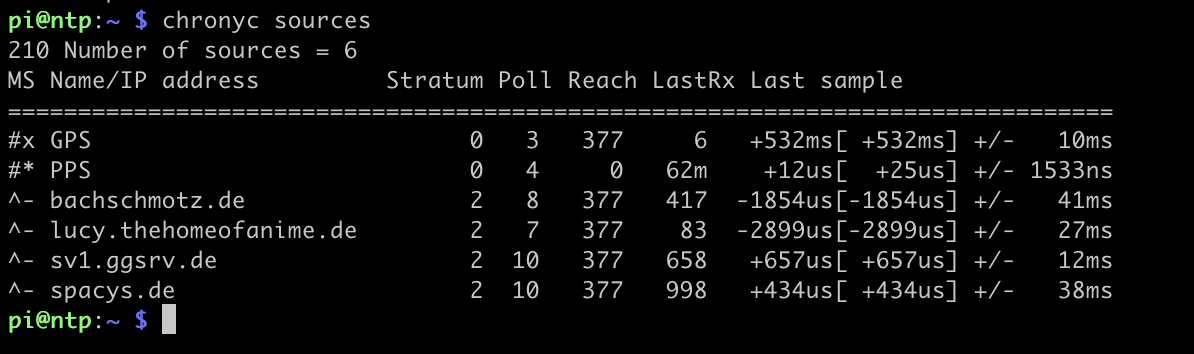 The *proves that we have a precise time source. Nanoseconds, phew! We also see the variation to the regular GPS signal, and some of the public NTP servers located in Germany.