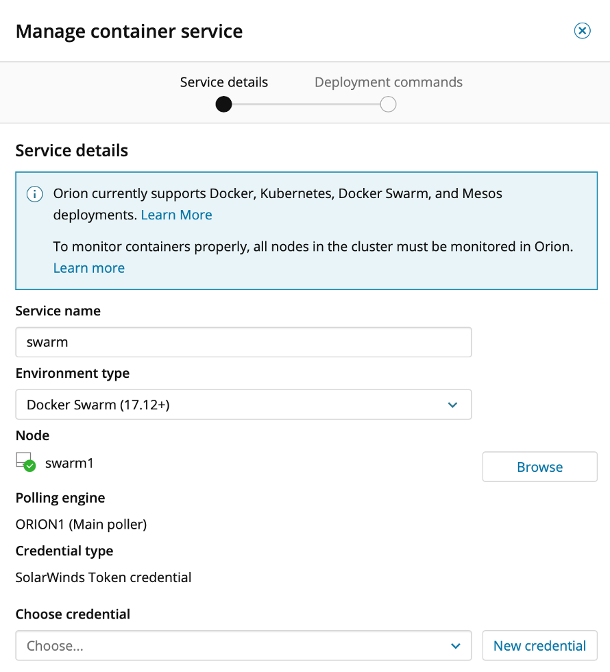 In the popup, we provide a creative name, select Docker Swarm as the environment, and select a manager node.