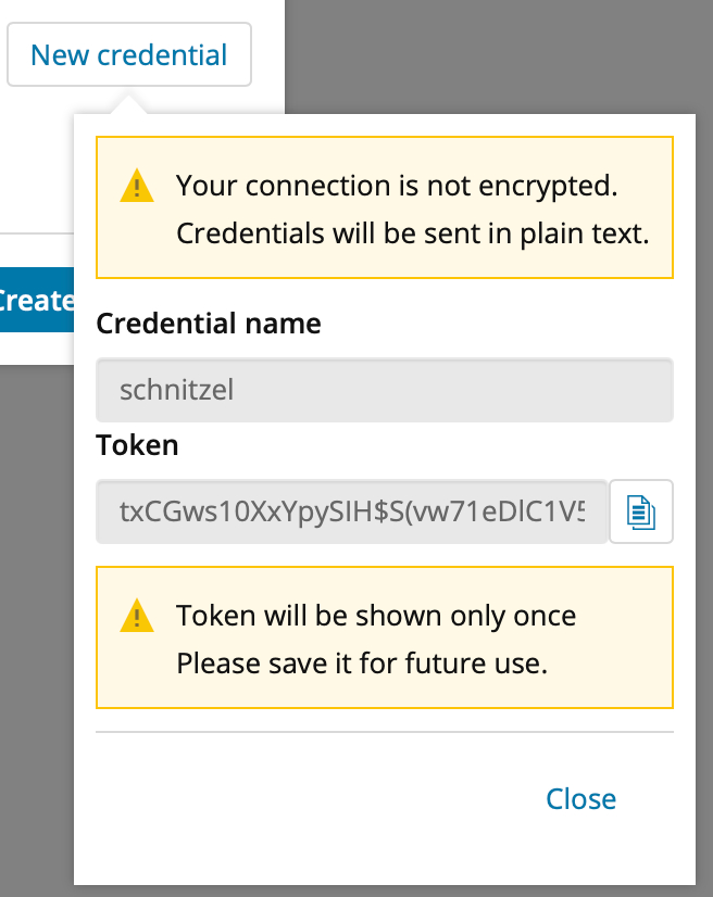 Attention: the credential name isn’t important, but copy and paste the token somewhere. Do it immediately before clicking anywhere else!