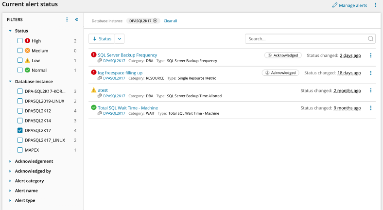 In the above example, the alerts were filtered to only display the alerts for the database instance DPASQL2K17.