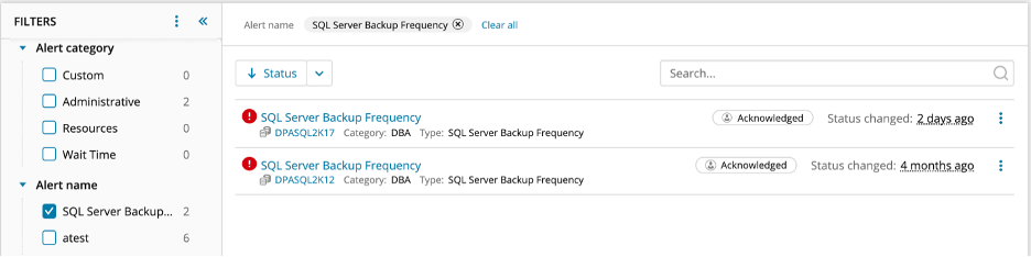 If you noticed the SQL Server Backup Frequency alert on DPASQL2K17, you may want to see if other database instances have missed their backup frequency as well. To do so, change the filters by selecting “SQL Server Backup Frequency” in the “Alert name” filter type.