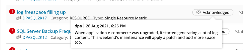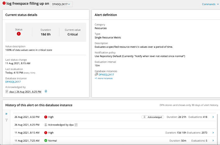Clicking on a “log freespace filling up” alert for DPASQL2K17 will take you to the following example. In the upper left, you can see the various details related to the current status of the alert, including the fact that it was acknowledged on August 26. In the upper right are the details of the alert’s definition and the list of database instances currently applying that alert.