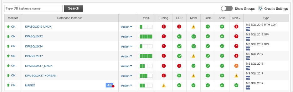 On the home page, you can now quickly identify which database instances have current alerts. A new “Alert” column has been added to the home page to show the worst current alert status for each monitored database instance.