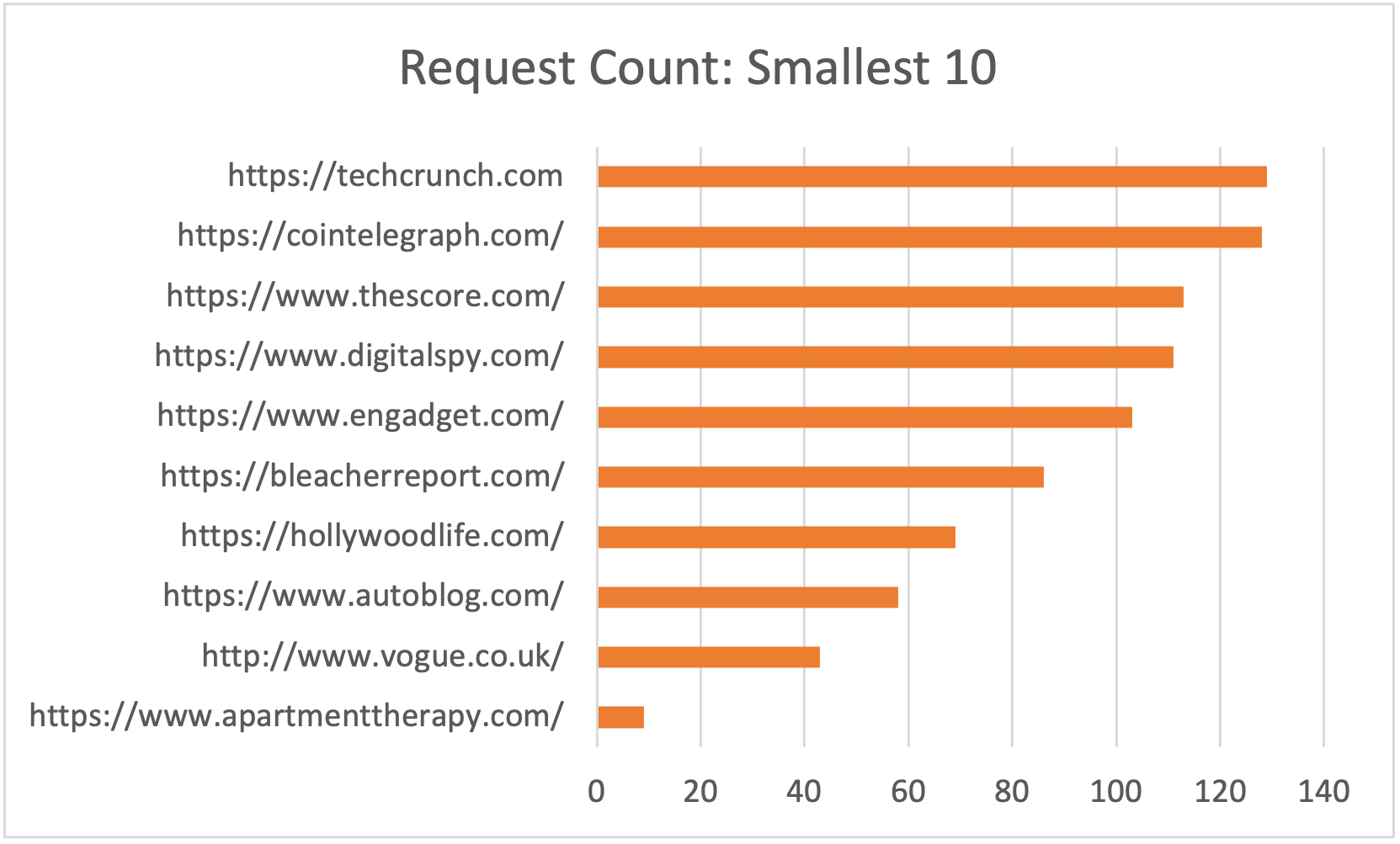 A large span of page sizes isn’t surprising. These sites could be text-, image-, or video-heavy and most likely change often. The smallest homepage—Apartment Therapy—tests in at 0.187MB, greets you with a large image taking up most of the screen above the fold, and is a clean design. This is different from People, which weighs in at 19.8MB, with video advertisements above the navigation and a compilation of articles and images.