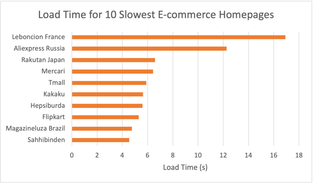 While we’ve seen a worse distribution of load times for the bottom 10 in our page speed testing, none of these sites meet the recommended three-second threshold. While Leboncion France might have some good deals, would you wait 17 seconds of a single page to fully load?