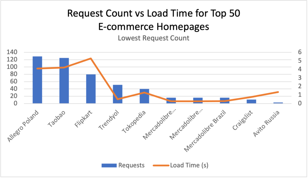 Avito, a Russian site, surprised us by tracking only three requests, but was still one of the slower loading sites (1.32 seconds) with the lowest number of requests. Comparatively, Craigslist had 11 requests and loaded in 0.764 seconds.