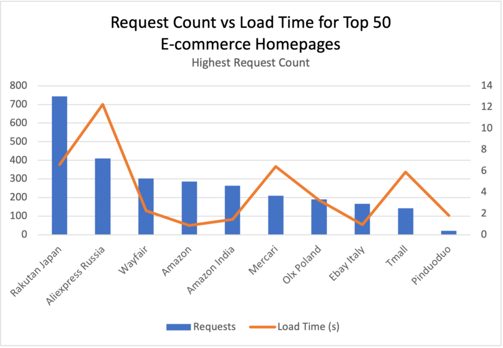 Half of the sites with the most requests still loaded in under three seconds, showing the work they have done to optimize their requests. The fastest of these sites, Amazon, loaded in 0.863 seconds with 286 requests. Imagine what the load time for Avito would have been with that many requests.
