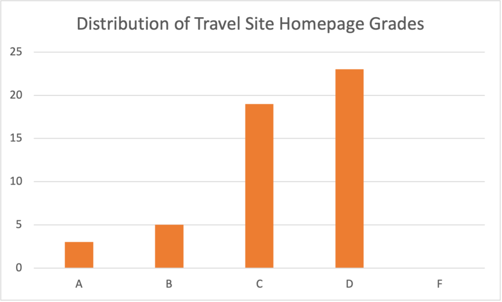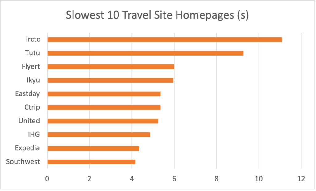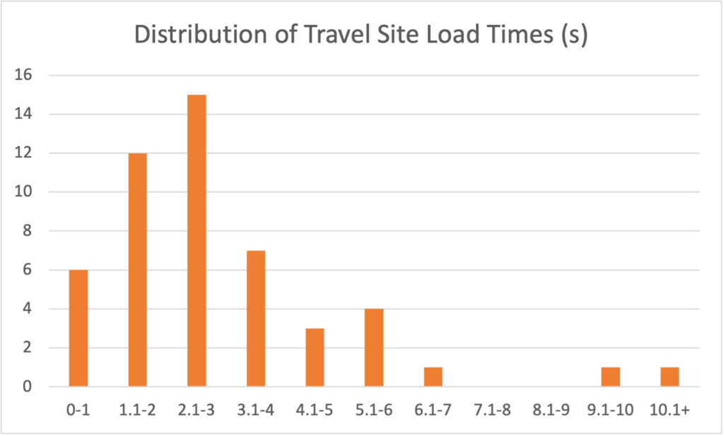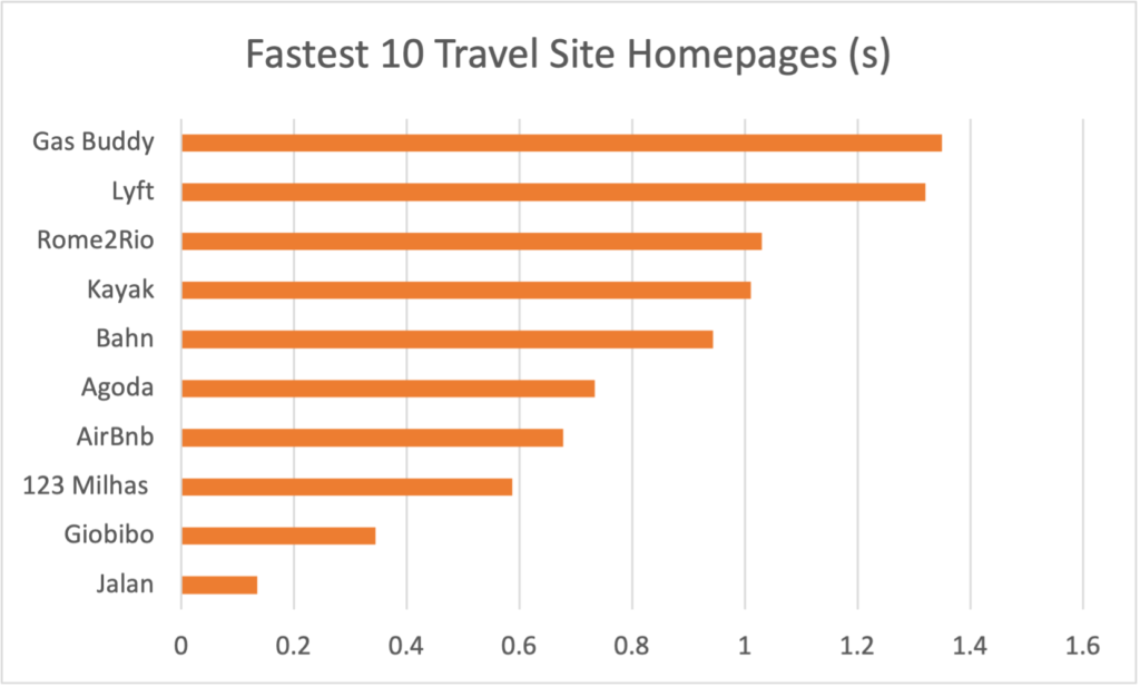 If you read our last web performance analysis post, you know the recommended load time is three seconds or less. With the average homepage loading in 2.9 seconds, these travel sites are quick. In fact, six of the quickest 10 sites loaded in under a second, with Jalan (which also scored an “A”) coming in at 0.135 seconds.