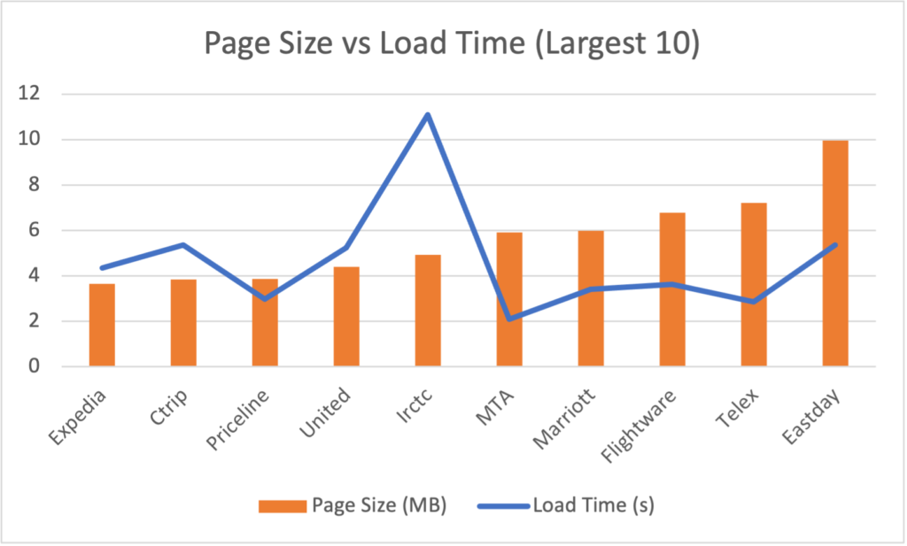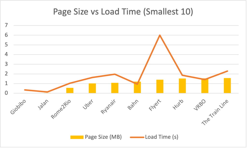 When reviewing how page size correlates with load time, we can see a clear relationship for our smallest 10 homepages: as the size grows, so too does load time. Unfortunately for Flyert users, despite a relatively small page, the load time will have them pause for an average of six seconds before they can access the full page.