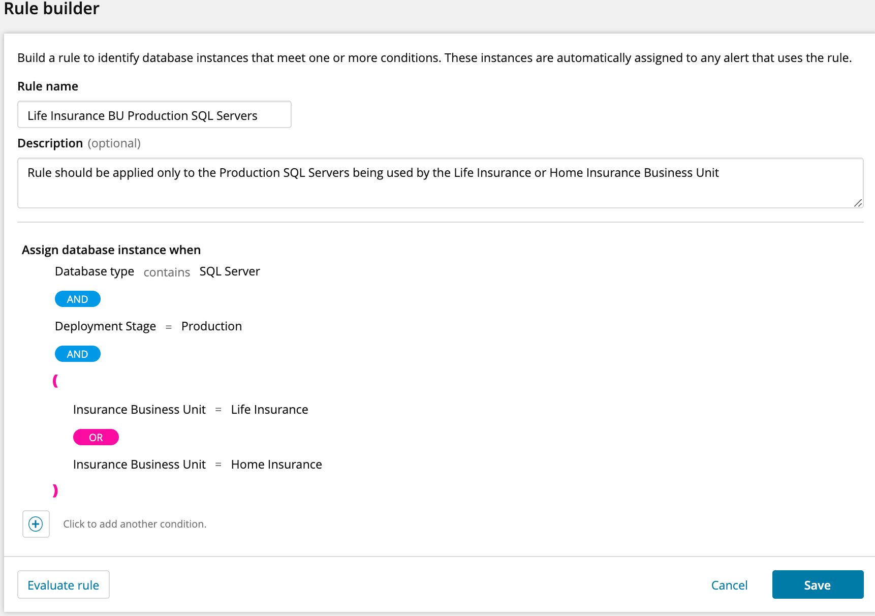 Create custom rules capable of being associated with multiple alerts and deciding which database instances meet the criteria for those alerts. The example rule for an insurance company below will assign all production PostgreSQL database instances associated with either the Life Insurance or Home Insurance business units.