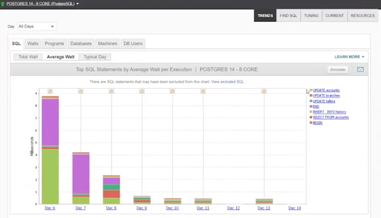 DPAs Top SQL Average Wait Time dashboard below shows my PostgreSQL tuning journey. Taking a few days to reduce transaction throughput from seconds to sub-millisecond.
