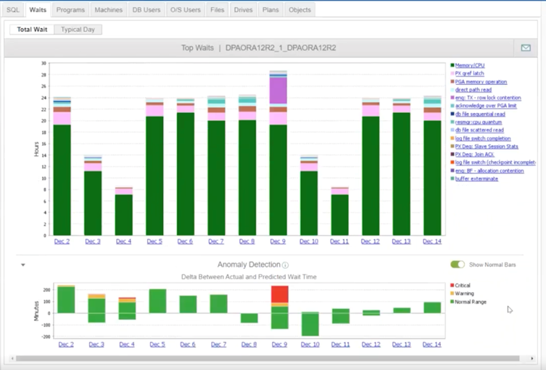 You can also use DPA for anomaly detection. It will tell you when things are deviating from the norm. For example, the Oracle wait time data on December 9 in the graph below catches my attention because it’s way out of bounds and is not typical of a Wednesday.