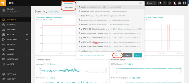 - Auto-remember and save the search mode: The host filter works in two search modes: “Select Host” and “Use Syntax.” DPM automatically remembers the most recently used search mode per user per session with this feature enhancement. This means the last used search mode is automatically selected when a user logs out, logs in, or changes different pages in the DPM web application.