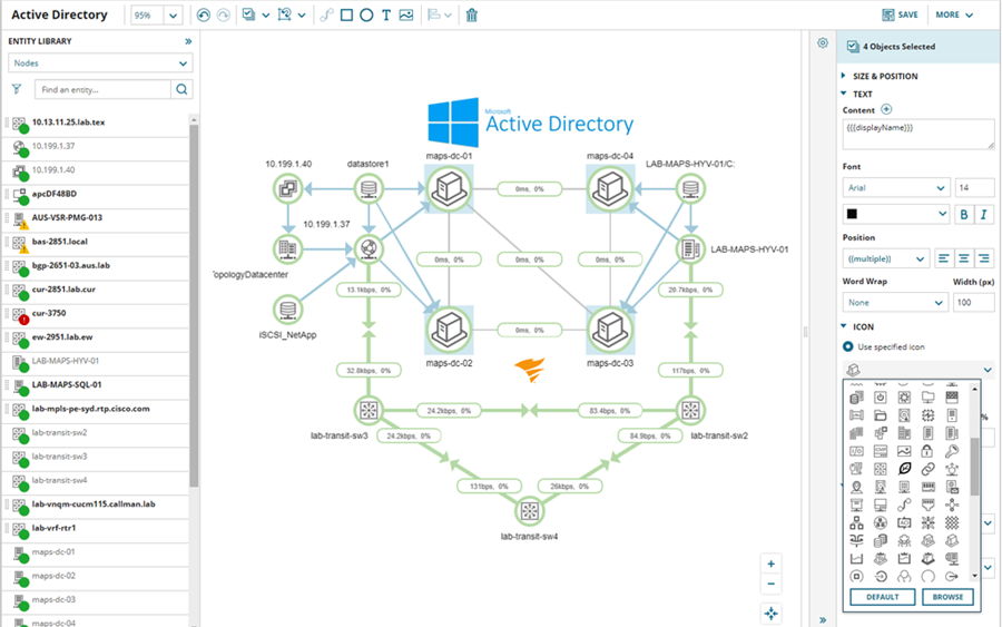 Auto-generated maps display entities associated with a particular application, specific vendor equipment, or other aspects of the infrastructure with drag-and-drop functionality.
