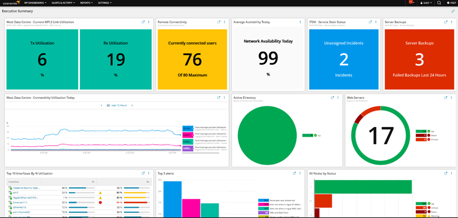 The Executive Summary dashboard in Hybrid Cloud Observability is designed to provide a high-level overview of your monitored network connectivity, infrastructure availability, server backup details, alert statistics, and third-party integrations. Through this dashboard, your teams can benefit from an at-a-glance ability to see and proactively respond to alerts before they become full-blown errors.