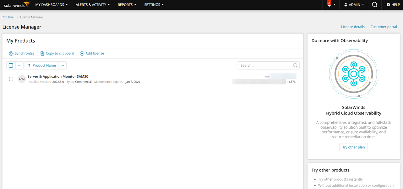 Once you’ve updated to 2022.3, functionality is controlled by licensing, so you can evaluate any other module or Hybrid Cloud Observability without download, install, downtime, or uninstall. Simply go to the License Manager page, pick the product you want to try, and turn it on. You’ll have access to full functionality for 30 days. And while turning on new functionality should have minimal impact on your server, adding more things to monitor will increase resource consumption.