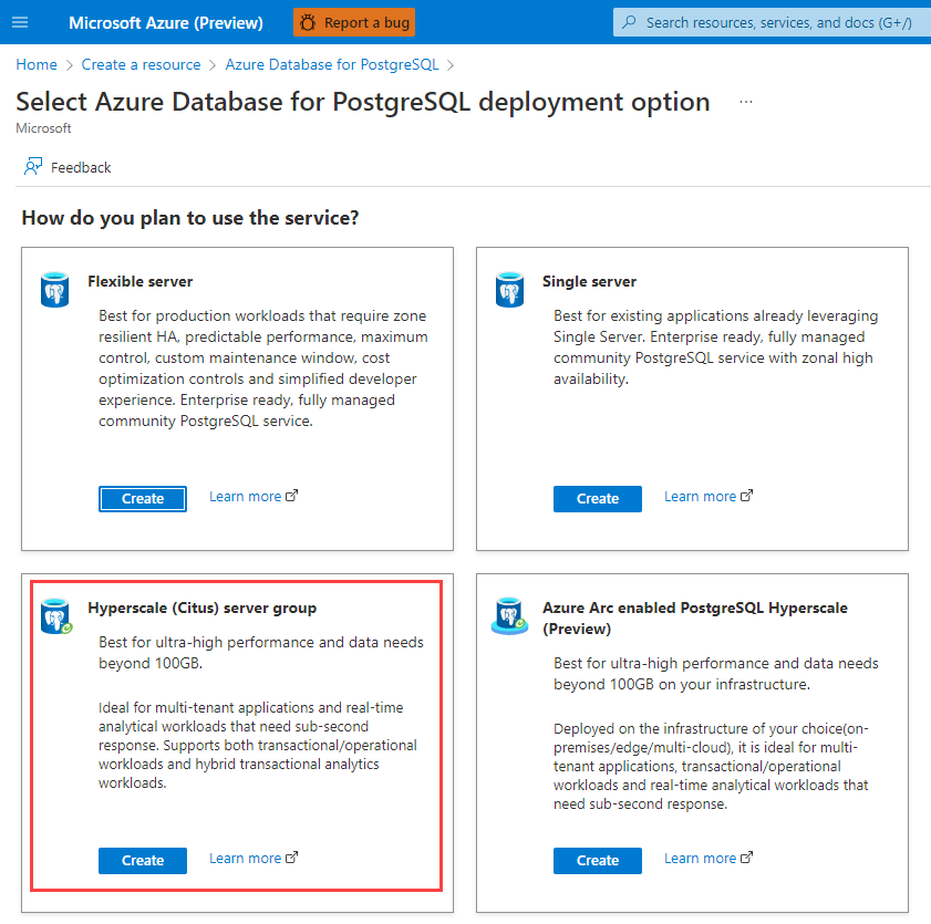 Azure Database for PostgreSQL has several options, and I will choose the “Hyperscale (Citus) server group” option. It’s called a server group because of the number of nodes working together to horizontally distribute the data.