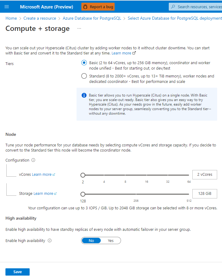 When moving your workload to Production, you should use the Standard tier so you can have multiple worker nodes. When you do this, you’ll need to determine how much compute and storage capacity the coordinator node and each worker node should have. In addition, you’ll need to choose how many worker nodes will be part of your server group. Twenty is the maximum for worker nodes by default, but you can contact Microsoft to increase this if you absolutely need more. There is only a single coordinator node, so you’ll just assign the vCores and Storage for it. You can also enable high availability, but remember that will double your costs.