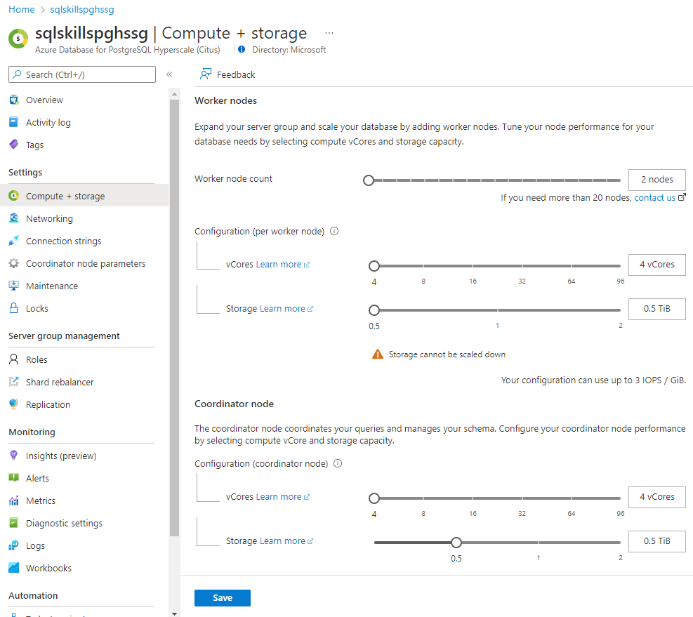 Worker nodes are the nodes in the server group responsible for storing the distributed data. The query engine knows how the data is distributed among the different worker nodes and will pull the necessary information from each node to the coordinator node to satisfy the issued queries. You can scale resources on existing worker nodes as demand increases or add worker nodes as necessary. Through the Azure portal, you can scale your workload up to 20 nodes, possibly expanding to even more nodes if you work with Microsoft directly.