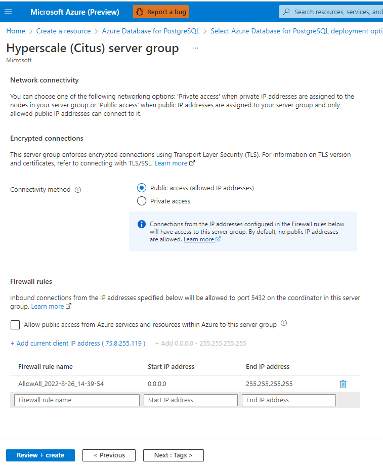 Finally, I’ll add an IP exclusion for my server, as public traffic isn’t allowed by default. In a Production environment, you’ll want to be a lot more sophisticated than allowing any IP to connect to your server. However, since this is simply a demo, I’ll allow it.