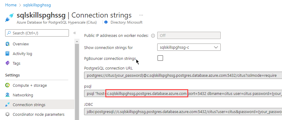 To connect to this server group, I’ll need to grab the full name of the coordinator node from the Azure Portal. To do this, select the “Connection strings” blade. From this screen, each of the Connection Strings has the server’s name. I have my server group name outlined in red below.