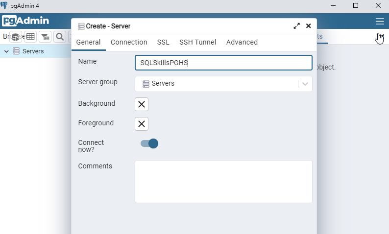 On the “Create Server” General tab, I’ll give this server a friendly name of “SQLSkillsPGHS.”