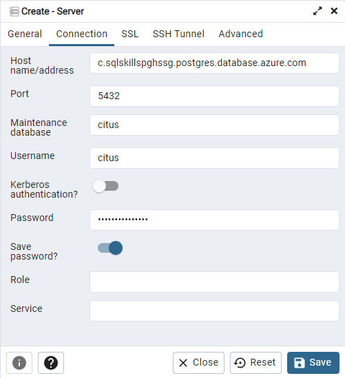 On the Connections tab, I’ll enter the server's address I pulled from the Azure portal. I’ll change the “Maintenance database” to citus and then enter the password for the citus user I entered when creating the citus server group.