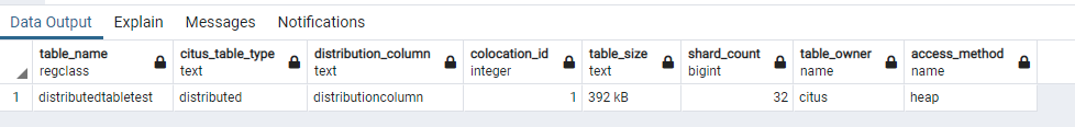 Next, I’ll use the PostgreSQL function generate_series to generate ten thousand rows to insert into the distributedTableTest table.