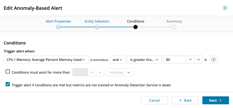 You can create anomaly-based alerts through a wizard with a similar look and feel to the standard Hybrid Cloud Observability alerting. The main step is composing an alert on a standard metric with an anomaly, which looks something like this: