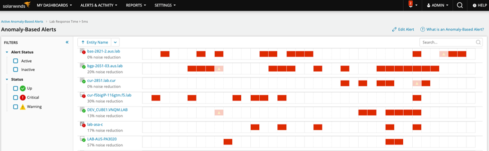 The detailed view of the alert expands to entities that fired the alert and provides the noise reduction factor, which indicates how often the alert would have fired if it hadn’t been composed with the anomaly state. During training of the machine learning models, the alerts are fired on the base condition with an icon representing the state to ensure key alerts are never lost.
