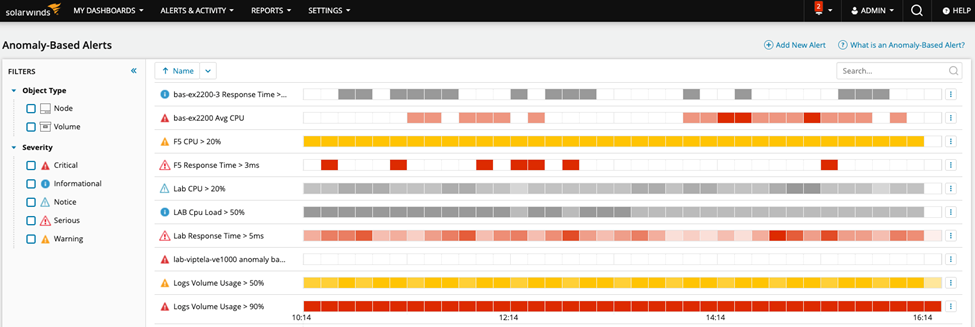Anomaly-based alerts can be seen in a timeline with a heatmap based on the frequency of their firing.