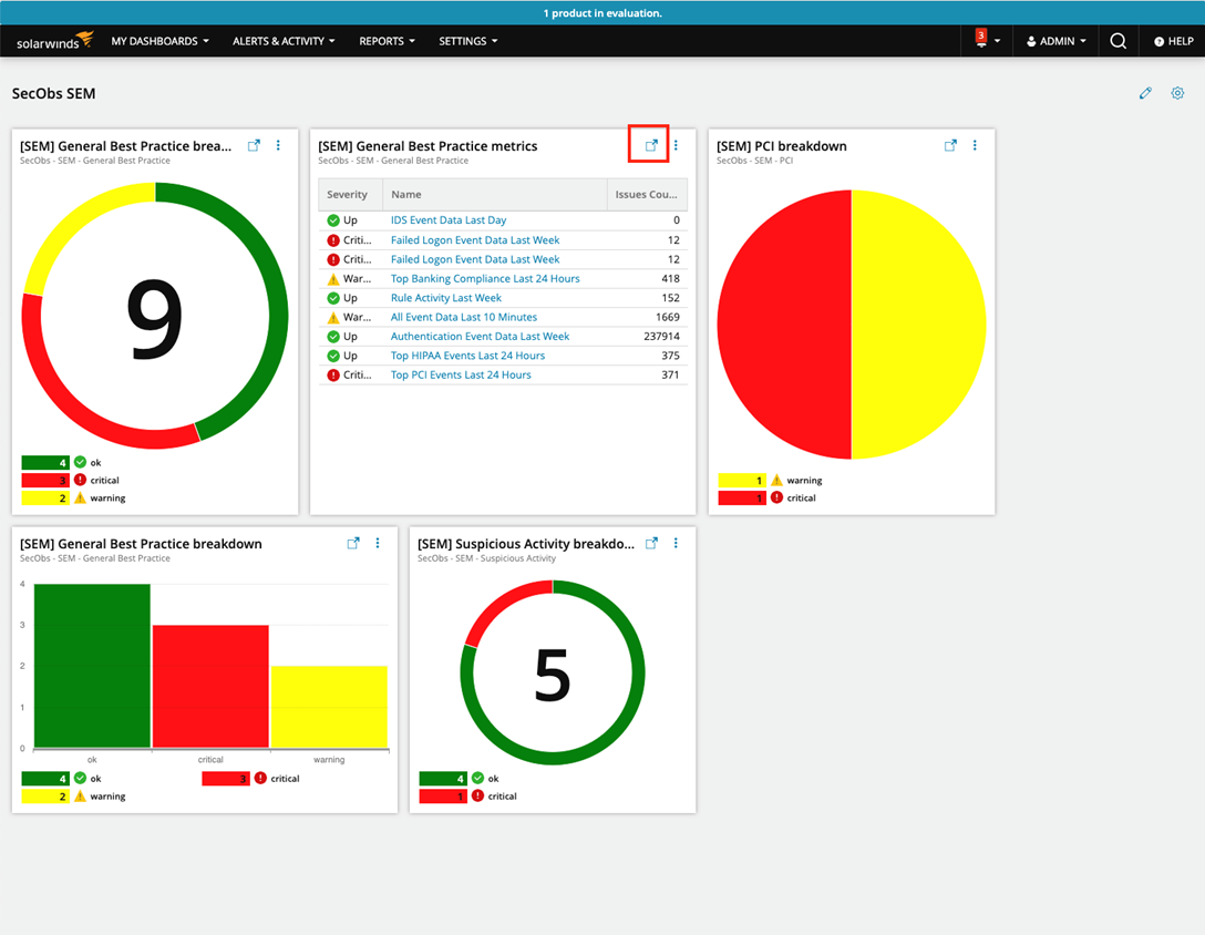 The little red rectangle highlighted in the middle widget in the picture above allows admins to launch in context into SEM for more details.