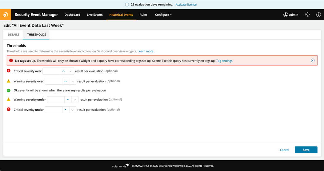 After adding tags, select the “Thresholds” tab and add the minimum and maximum thresholds for the number of results of the saved query to determine the severity level. For example: “critical” if number of results over 1000, and “warning” if results over 100 but below 1000, etc. Based on the set thresholds, the SEM widgets in Hybrid Cloud Observability will show green, red, or yellow for “ok,” “critical,” and “warning” levels.