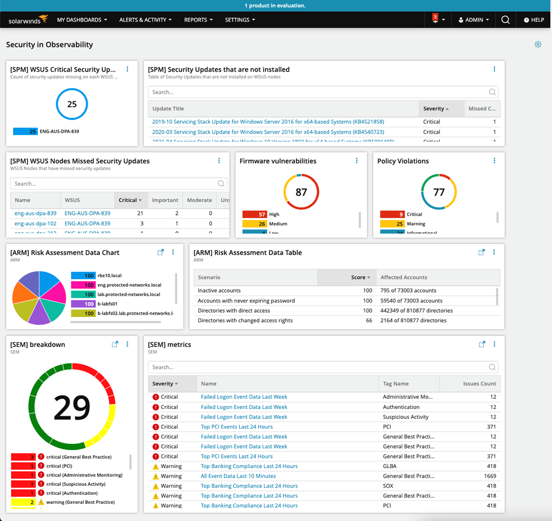 This page shows summary widgets from not only SEM and ARM but also displays important updates from Patch Manager and firmware vulnerabilities and policy violations widgets from Network Configuration Manager (NCM), as well as providing a true single-pane-of-glass view of items relevant to identifying critical security issues.