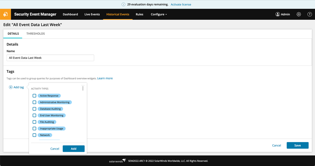 To edit a saved query, select “Edit” against the query name, and in the “Details” tab, add a tag corresponding to the category of events. For example: “General best practice metrics” or “PCI.” In this release, a select set of tags are available in SEM to choose from.