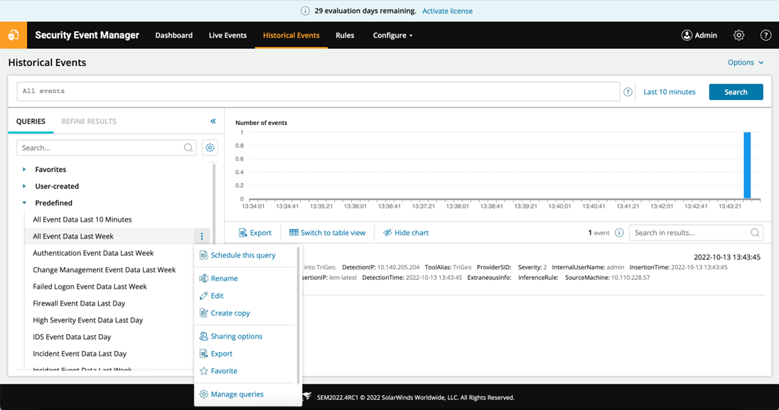 In SEM, under the tab “Historical Events,” there’s an option to view or add saved queries for filtering the events.