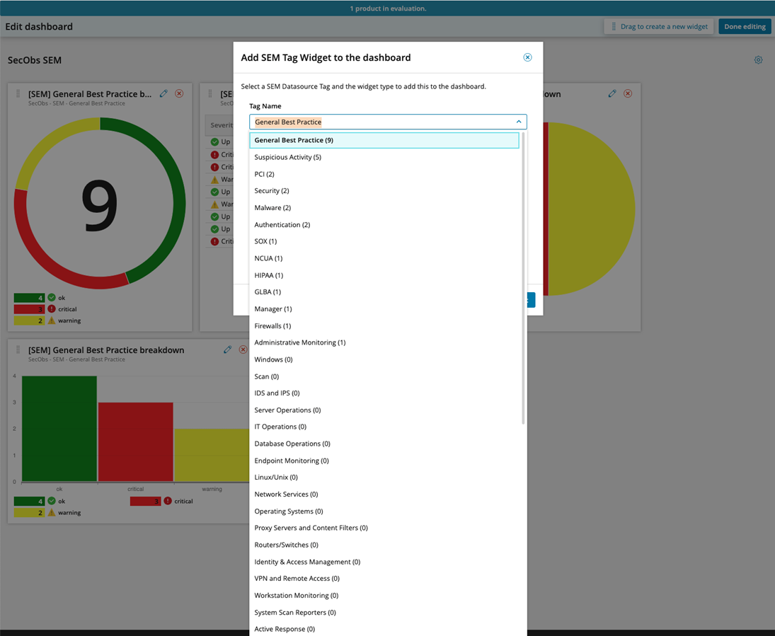 - Additionally, under the security tab is a separate option labeled “SEM summary dashboard,” showing some key security activities and metrics from SEM. The widgets shown from SEM are based on SEM saved queries which are scheduled to execute at any frequency and with tags like “General Best Practice metrics” or “PCI breakdown,” etc. For each of those queries, you can set minimum or maximum thresholds to determine the severity level of these queries as “ok,” “critical,” or “warning.” More on saved queries in SEM in the “SEM saved Queries/Tags section below.