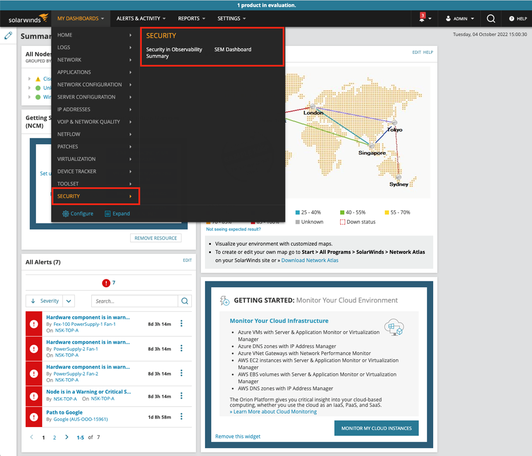 For Hybrid Cloud Observability Advanced customers, we have a new integration with our security products, SolarWinds Security Event Manager (SEM) and SolarWinds Access Rights Manager™ (ARM). Customers with deployed SEM and/or ARM products can now integrate with Hybrid Cloud Observability and have visibility into security dashboards within Hybrid Cloud Observability. This allows IT admins to have a single-pane-of-glass view of the top security events and issues they care about, and if required, they can launch in context into SEM or ARM, reducing their mean time to identify issues.
