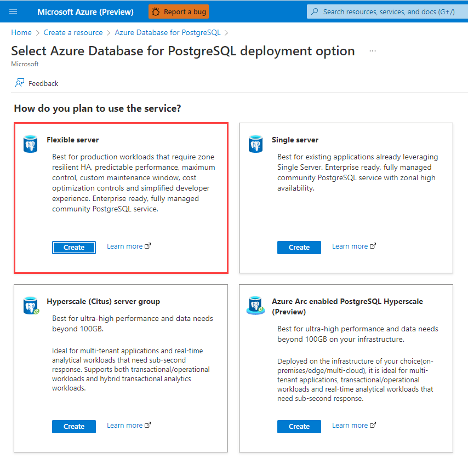 The next page is where I’ll choose a deployment option. I’m looking at Azure Database for PostgreSQL Flexible Server, so I’ll click the “Create” button on the “Flexible server” option.