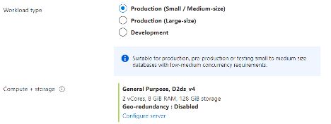 I’ll need to assign resources to this server based on my expected overall throughput. Here, I’ll choose the small/medium-sized prodution tier as the workload type. Under “Compute + storage,” I’ll click “Configure Server” so I can assign the necessary number of virutal cores, memory, and storage.