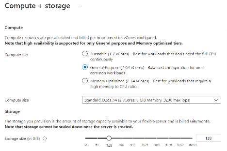 The tiers are differentiated by the amount of compute in vCores capable of being provisioned, memory per vCore, the storage technology used to store the data, and—of course—pricing. The first choice I’ll need to make when configuring compute and storage is which compute tier to use. The burstable tier is great for applications not constantly needing CPU. These are generally smaller applications or those only needed for certain times throughout the day. The general-purpose tier is applicable to most workloads needing dedicated CPU throughout the day and balanced compute and memory with scalable IO throughput. The memory optimized tier is for high-performance applications reuqiring a lot of memory, fast disks, and high concurrency needs, and high-end transaction processing production applications should be assigned to this tier.