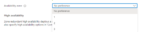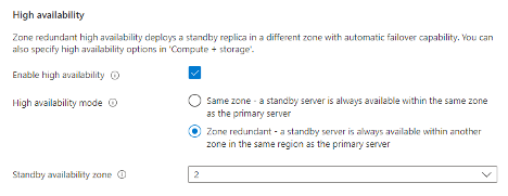 When high availability is configured, Flexible Server automatically provisions and manages a standby replica. “Same zone” places the primary and the standby server in the same availability zone. This option has low network latency and a service-level agreement (SLA) uptime of 99.95%. There’s no need to configure application redundancy with this option, as the application, primary, and standby server are all in the same Azure availability zone.