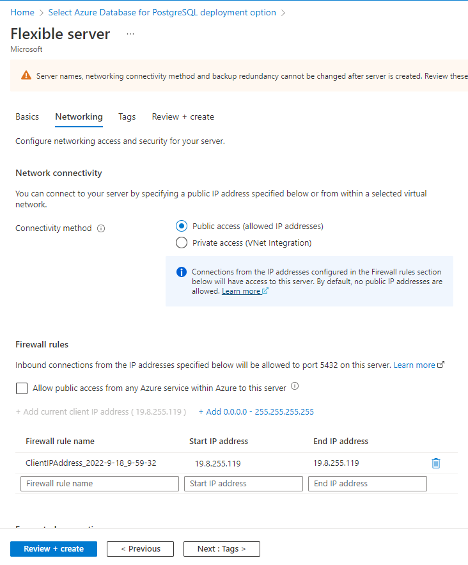 Finally, I’ll need to choose how connections are going to be made to my Azure Database for PostgreSQL Flexible Server. If I’m going to have applications running from VMs or the Azure App Service, I can limit any public connections to my database. However, if applications or users from the public internet need to connect to my database, I’ll need to choose the “Public access” option. Here, I’m going to choose the public option and enter my public IP address into the firewall rules.