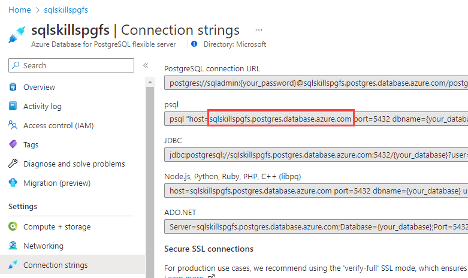 Once the deployment is complete, I should be able to connect to my new PostgreSQL database. To connect to the database, I’ll need the server’s full name. I can navigate to the “Connection Strings” blade in the Azure portal and grab the server name from there.