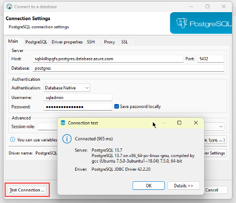 Under the connection settings, paste in the full name of the Azure PostgreSQL server you copied from the Connection Strings from the Azure Portal in the previous step. Then, enter your admin username and password. Once you’ve entered everything correctly, you should click the “Test Connection” button to ensure you can connect to your new PostgreSQL server.