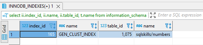 Here I will query two different information_schema tables for the InnoDB storage engine. The innodb_indexes view stores information regarding indexes, and the innodb_tables view returns information regarding tables. We see from the output that there is an index with the name of GEN_CLUST_INDEX, which was created automatically for us when the table was created.