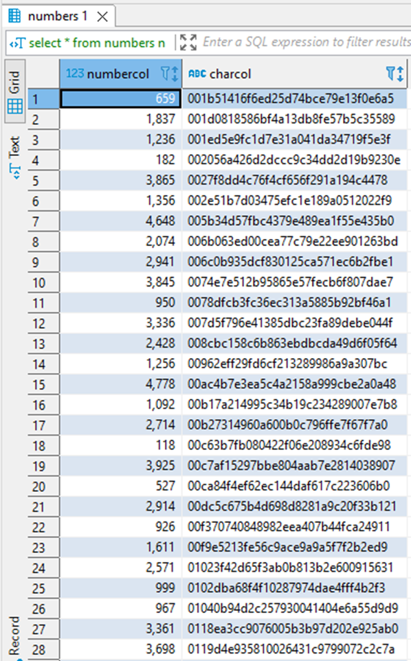 Next, I’ll create a table named numbers with two columns; numbercol, which will store monotonically increasing values, and charcol, which will store a randomized string, with data types int and varchar respectively: