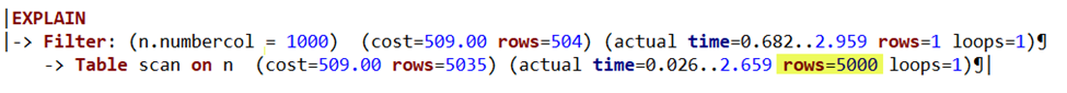 I can use the EXPLAIN keyword to return the execution plan for a query. When it is used with the ANALYZE option, the query's actual execution plan is returned. In other words, the query is executed, and the query execution plan is surfaced. We can see from the output of the execution plan that the number of rows touched is 5,000 – or the entire number of rows in the table, along with a high cost. In other words, even though this table does have a Clustered Index, it is not useful for querying purposes because the index key is essentially the rowid – which doesn’t include the numbercol column.