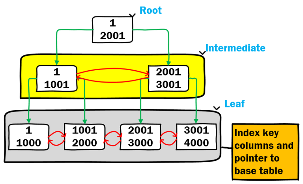 B-tree indexes can be considered an upside-down tree structure where the root page is at the top. Intermediate-level pages store pointers to additional pages in lower levels in the index. For MySQL clustered indexes, once you get to the leaf level of the index – all the columns in the table are stored in the B-tree structure. These intermediate level pages and leaf level pages are doubly-linked lists – they maintain the ordering of the index, so it is possible to easily find values in the ordered list but also to be able to order the resultset in ascending or descending order without additional work to provide the sort. There is no separate storage for table data.
